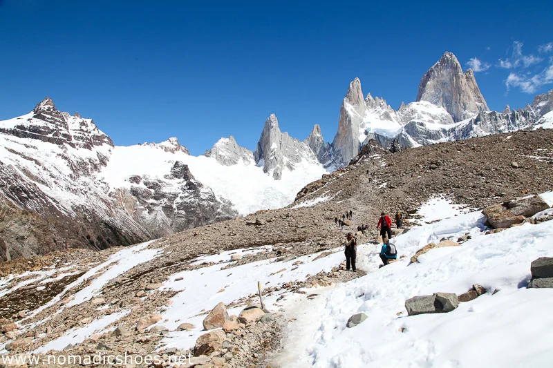 Ráno jsme si po delší době na cestách přispali a vzbudili se do nádherného dne. Slunce svitilo, na nebi ani mráček a my poprvé viděli v plné kráse Cerro Fitz Roy. Po pozdní snídani jsme vyrazili na 2,5 kilometru dlouhý trek k jezeru Lago de los Tres. Převýšení 400 metrů. Velmi strmý terén, nekonečný stoupák, než jsme se konečně dostali k neskutečně modrému ledovcovému jezeru Lago de los Tres. Bohužel s námi i spousta lidí. Nad námi se pyšně pnul Fitz Roy a počasí bylo nadherné i přes studený vitr a kumulující se mraky naopak dodávaly celé krajině zvláštní výraz.