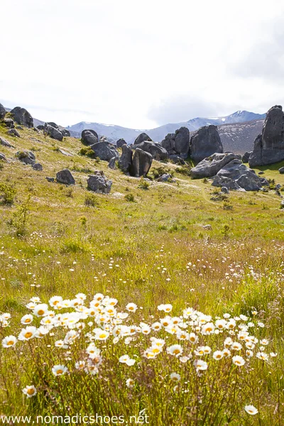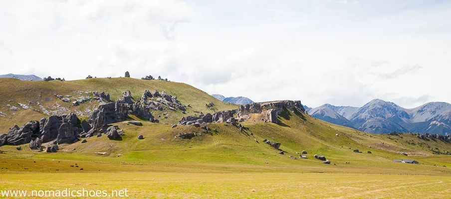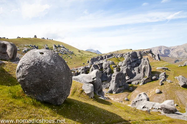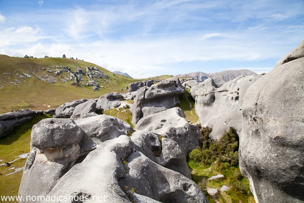 Naše první zastávka, pokud nepočítám vyhlídkové terasy, jsou vápencové skály Kura Tawhiti. V překladu to znamená - poklad ze vzdálené země. Skály jsou rozesety na rozkvetlé louce a při pohledu na některé z divných tvarů se nechce ani věřit, že je nikdo do té podoby nevytesal. Pro maorský kmen Ngai Tahu je to posvátné místo a z toho vyplývají i pravidla pro populární lezení - skoby, které přes den do skal zatlučete, musí večer ven. Trávíme tam skoro hodinu a užíváme si letního sluníčka.